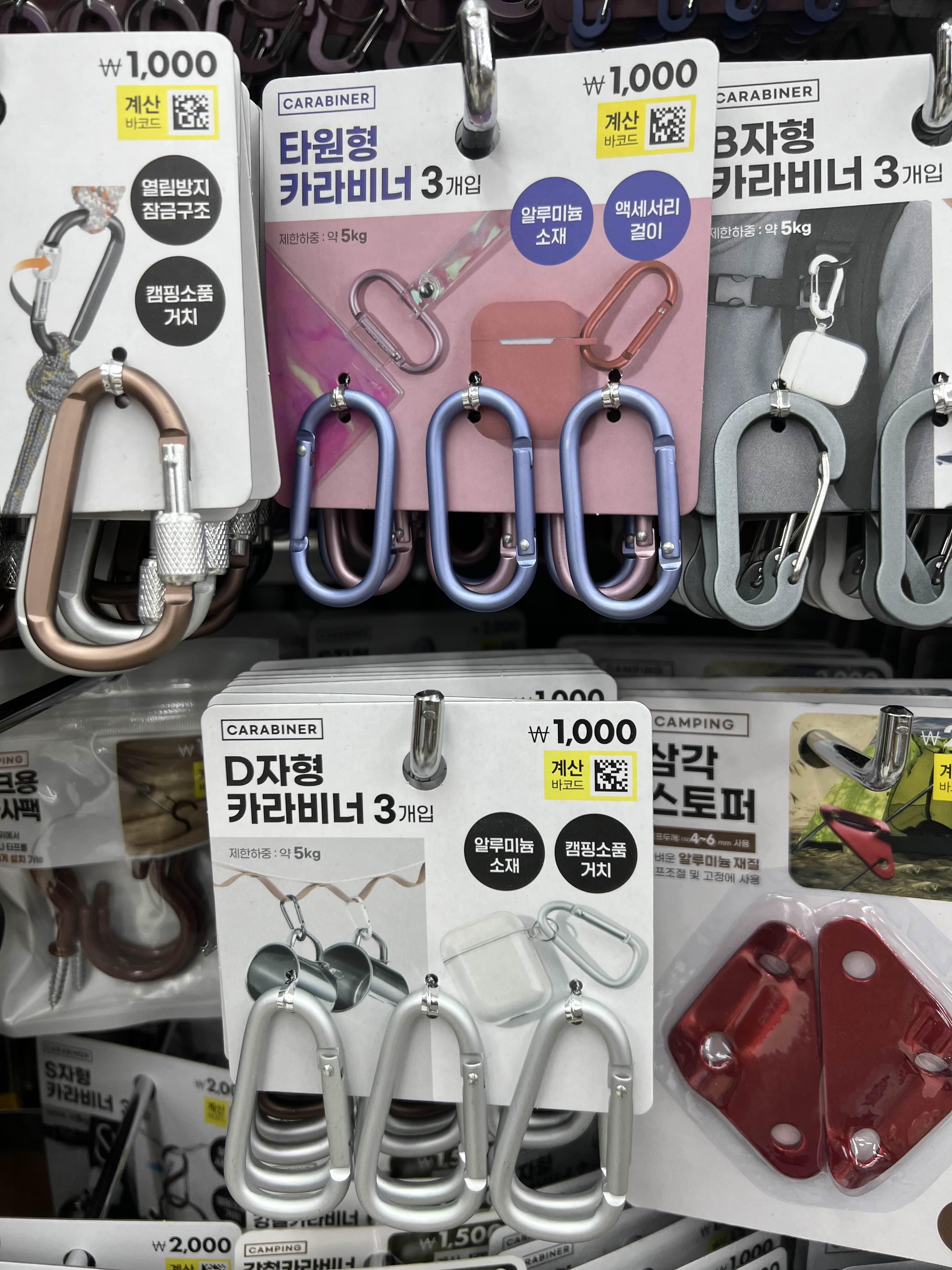 가벼운 용품을 걸기위한 용도라면 다이소에서 저렴하게 비너를 구매 하면 좋을듯 하다.