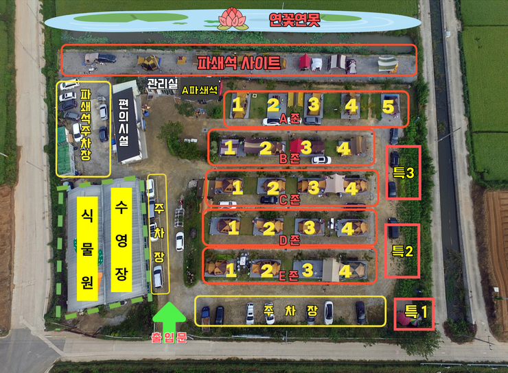 입구 우측에 주차장과 타프존 자리가 있다.