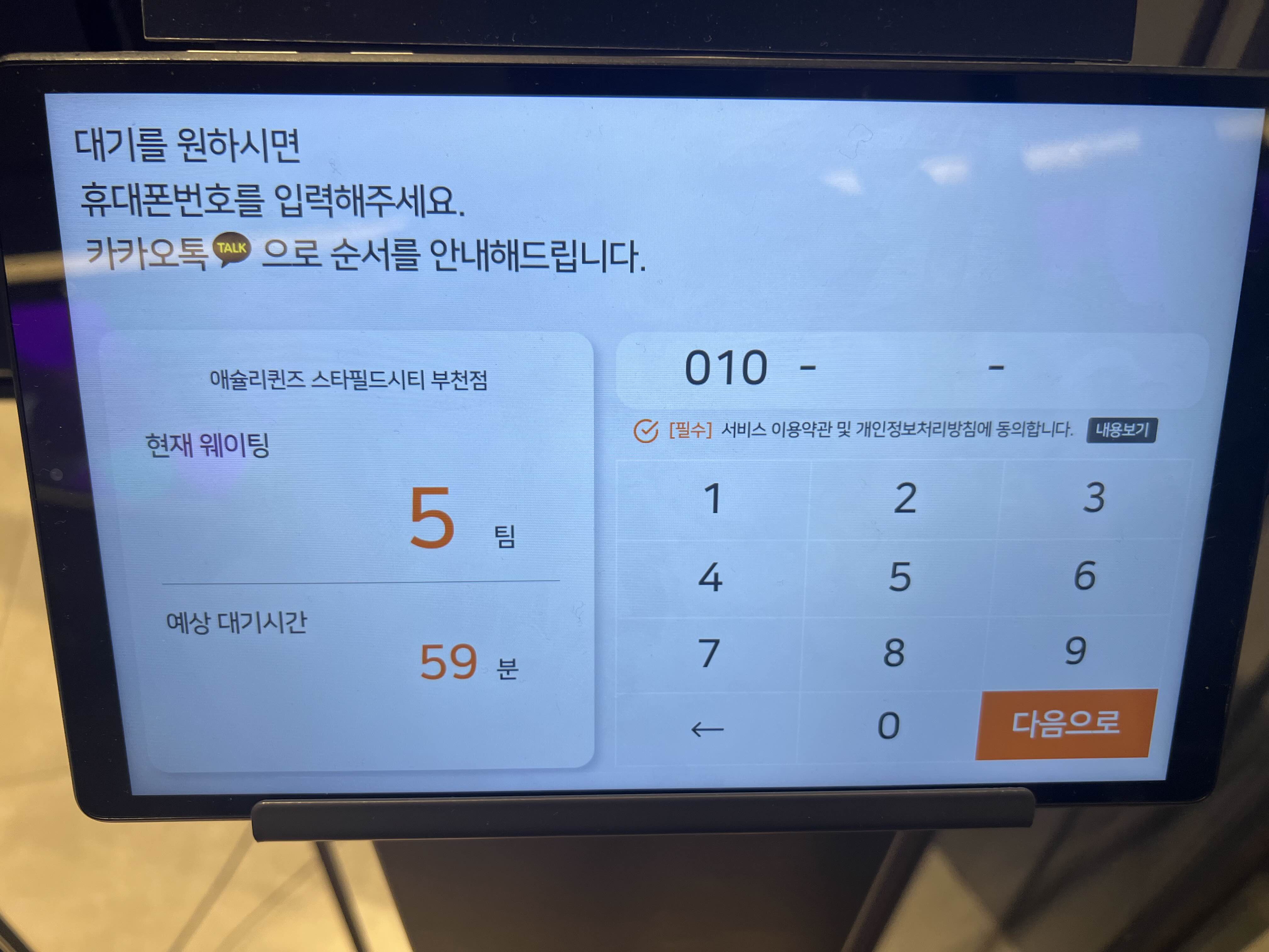 핸드폰 번호와 식사 인원을 입력하면 카카오 알림톡으로 대기 번호와 대기 시간등이 전송되어 온다.