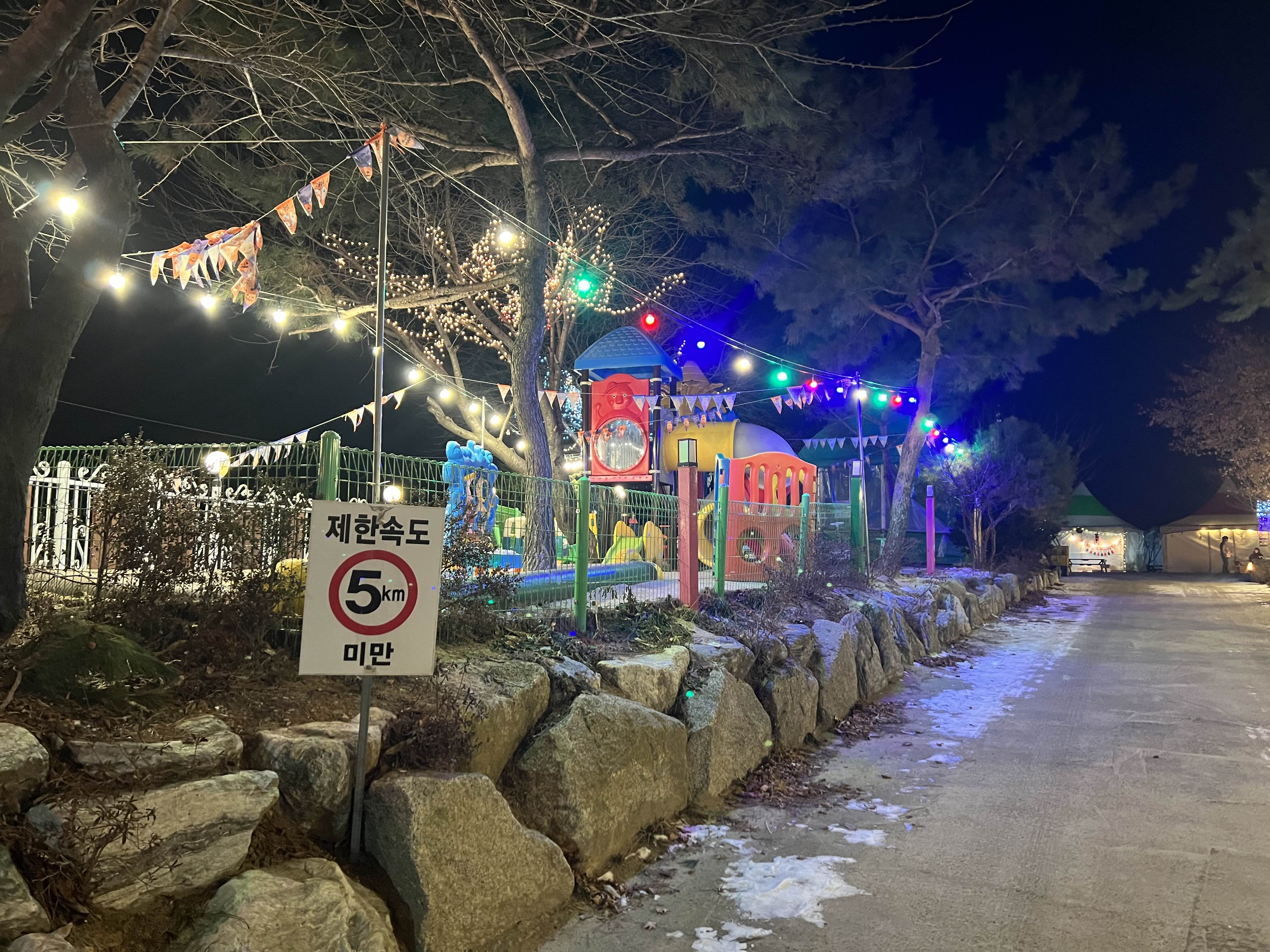 캠핑장 입구인데 4계절 내내 야간에는 예쁜 전구들이 켜진다. 숲이 되면 더더욱 예쁜 나무가 된다.